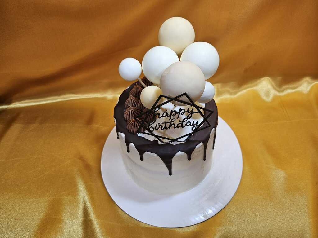 Bizcocho esponjoso de vainilla, relleno de ganache de chocolate con leche y cubierto con suave chocolate blanco. ¡Pura elegancia y dulzura!